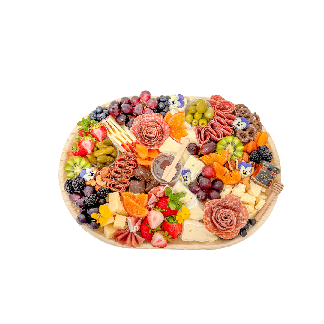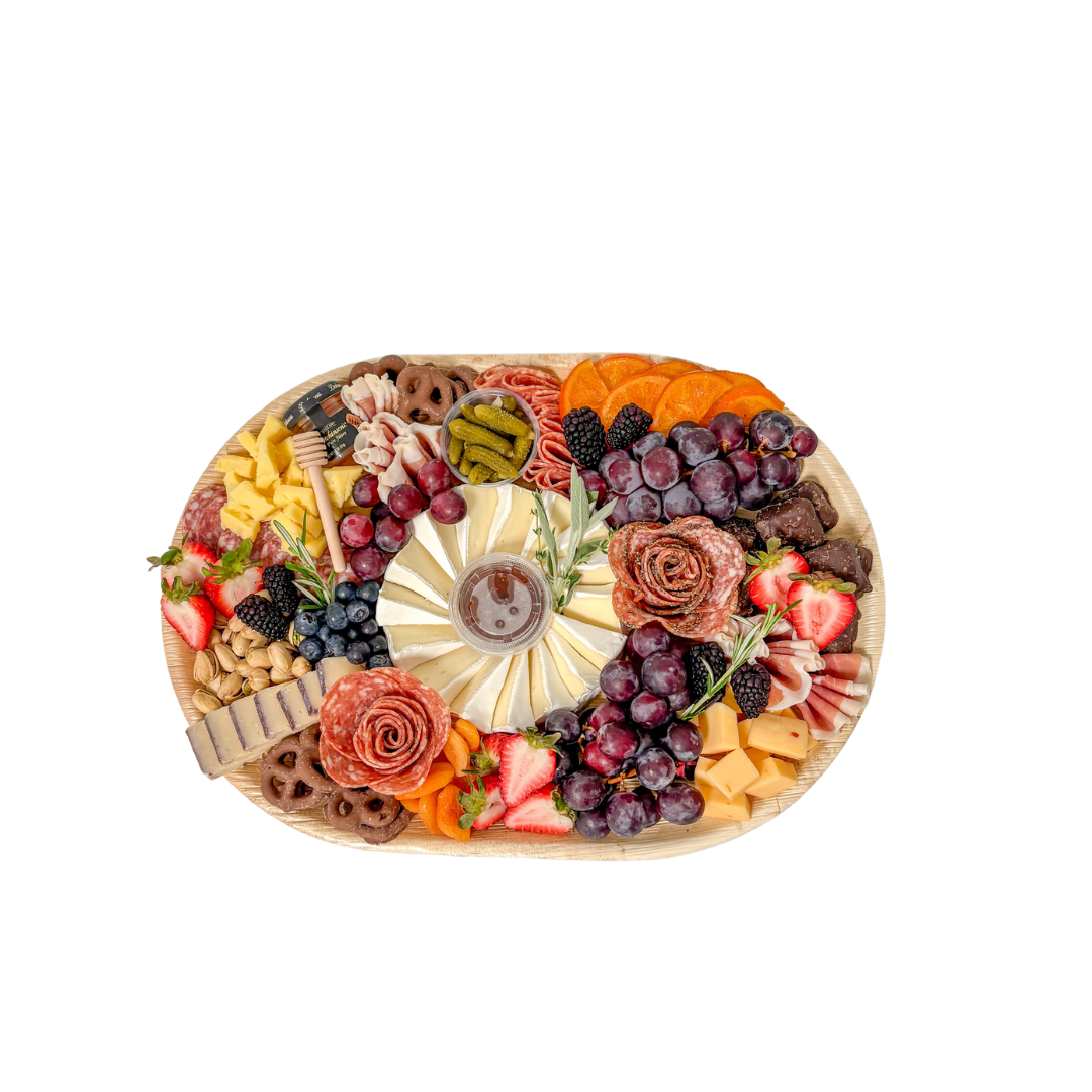 An assortment of cheeses, meats, fruit, nuts, jam, and various accompaniments on a disposable bamboo tray. Crackers served on the side. Ingredients based on availability and seasonality. Great for a group of 7-9 as an appetizer.